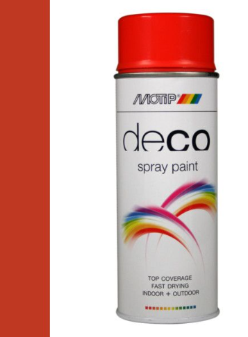 Deco paint 400 ML ral 2002 Bloed oranje HG met een zeer hoge dek- en vulkracht en uitstekende hechting. Deze decoratieve lak is voor het behandelen van behandelde en onbehandelde ondergronden van hout, metaal, aluminium, glas, steen en diverse soorten kunststof. Motip deco paint heeft een duurzame kleur, glans, en goede corrosiewering en is bestand tegen benzine, chemicaliën en weersinvloeden.