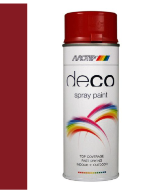 Deco paint 400 ML ral 3003 Robijn rood HG met een zeer hoge dek- en vulkracht en uitstekende hechting. Deze decoratieve lak is voor het behandelen van behandelde en onbehandelde ondergronden van hout, metaal, aluminium, glas, steen en diverse soorten kunststof. Motip deco paint heeft een duurzame kleur, glans, en goede corrosiewering en is bestand tegen benzine, chemicaliën en weersinvloeden.