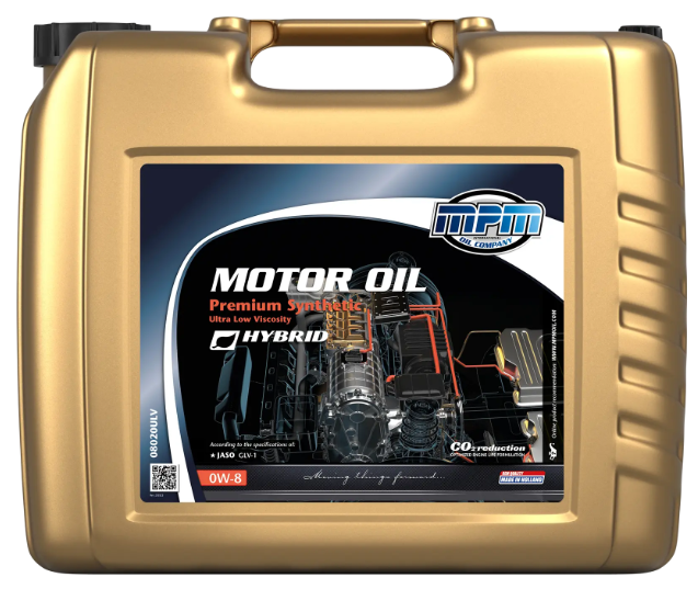 MPM 0W8 Motorolie heeft een ultra lage viscositeit (ULV). Hierdoor is deze motorolie ideaal voor 0W80 motoren met een turbo in Plug-in Hybride Elektrische Voertuigen (P.H.E.V.) en Hybride Electrische Voertuigen (H.E.V.). Deze 0W80 motor olie heeft lage wrijvingseigenschappen en HTHS waarde, hierdoor werkt deze brandstof besparend. MPM 08000ULV biedt tevens een zeer goede bescherming van het motorblok bij verschillende bedrijfstemperaturen en koude weersomstandigheden. Verder zorgt deze motorolie SAE 0W8 voor een versnelde opbouw van de oliefilm bij het opstarten van het motorblok, dit zorgt voor minder uitstoot van CO2.